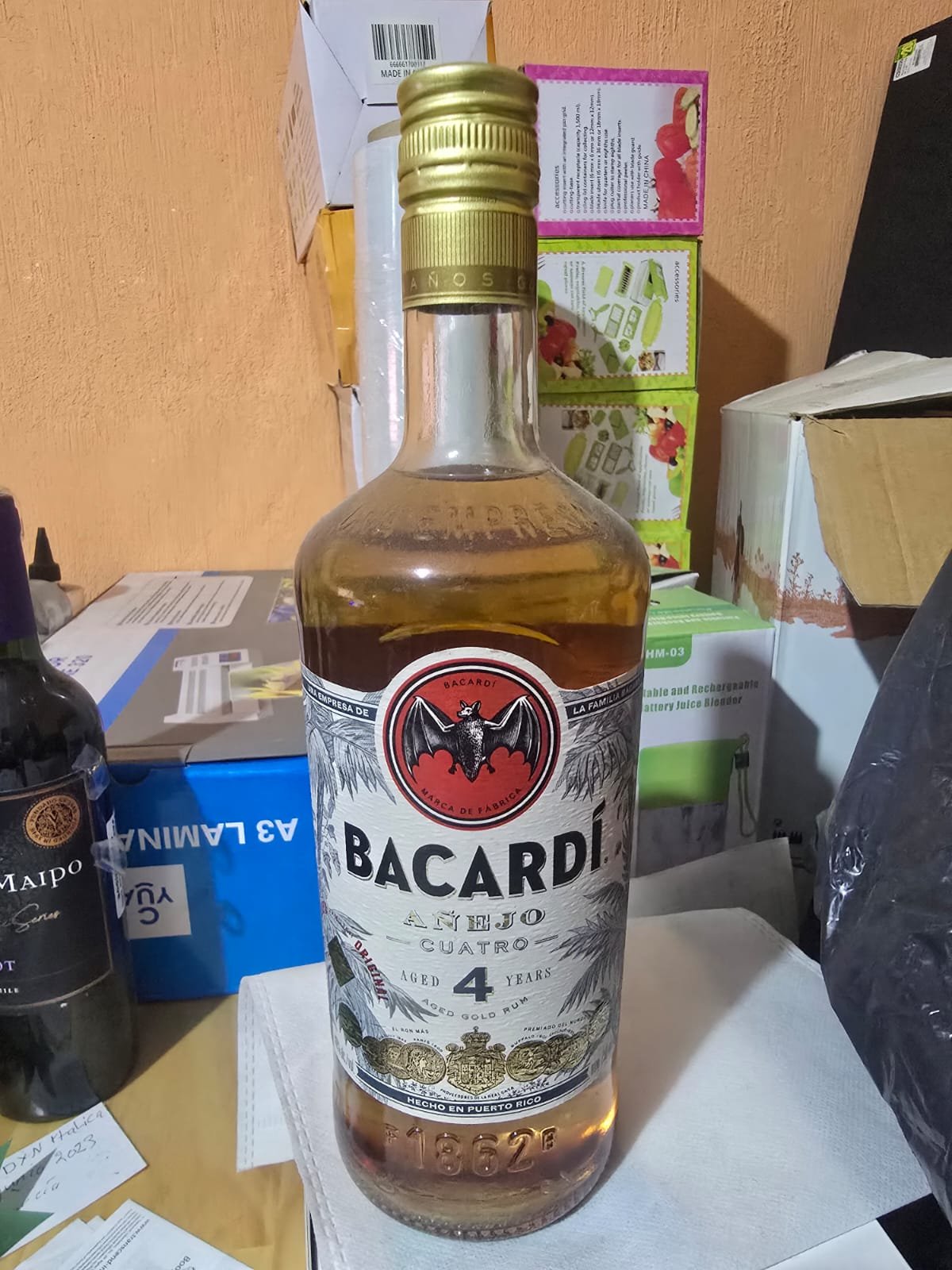 Botella de ron añejo marca Bacardí 4 años.